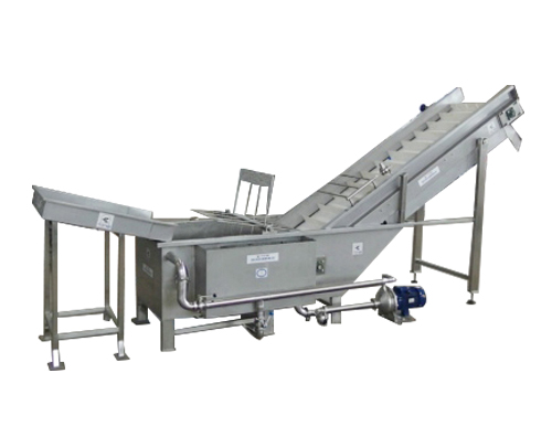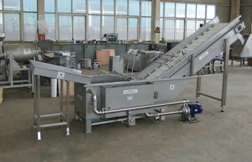 該設(shè)備為果蔬加工生產(chǎn)線關(guān)鍵設(shè)備之一,用于果蔬的清洗提升作業(yè)。該清洗機(jī)是以風(fēng)機(jī)風(fēng)力使水產(chǎn)生強(qiáng)烈攪拌運(yùn)動(dòng), 使物料在水中翻滾, 特殊物料增加翻爪結(jié)構(gòu),提高清洗效果,同時(shí)安置在進(jìn)料口的高壓水管噴頭將物料用水力推向提升機(jī)方向,經(jīng)清洗的果蔬由提升機(jī)輸入下道工序。該設(shè)備為果蔬汁生產(chǎn)線中必備機(jī)械,廣泛適用于蔬、果的清洗,使用方便,節(jié)水效果顯著。